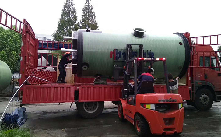 預制一體化泵站外部有排氣口、入孔頂蓋、扶梯、進氣口、吊耳、出水口、出線孔、玻璃鋼筒體、進水口、灌漿孔等組成。